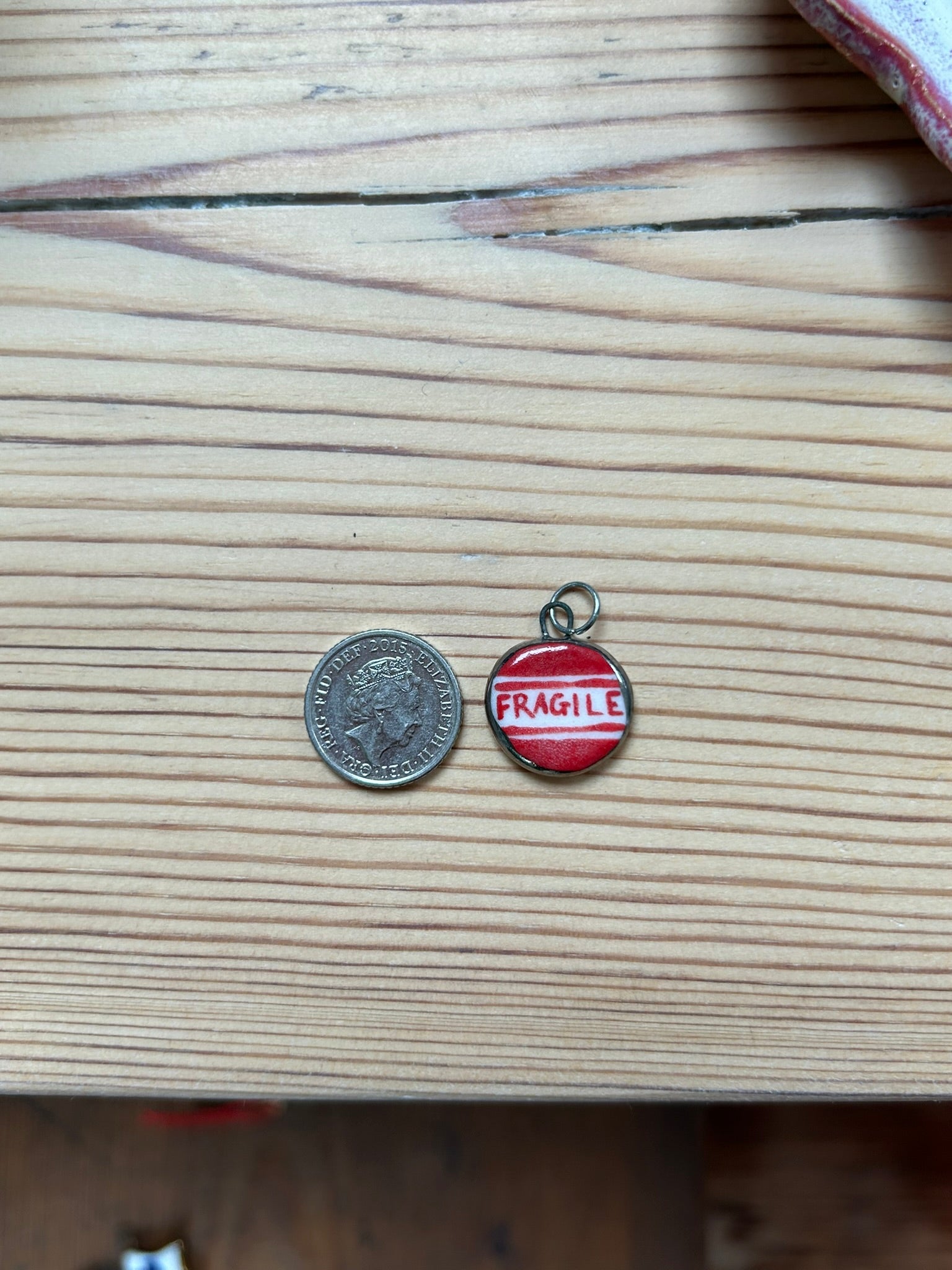 The pendants are taken next to a 5p coin to compare the size. For reference, a 5p coin is 18mm wide. Each pendant varies in size, no pendant is the same.