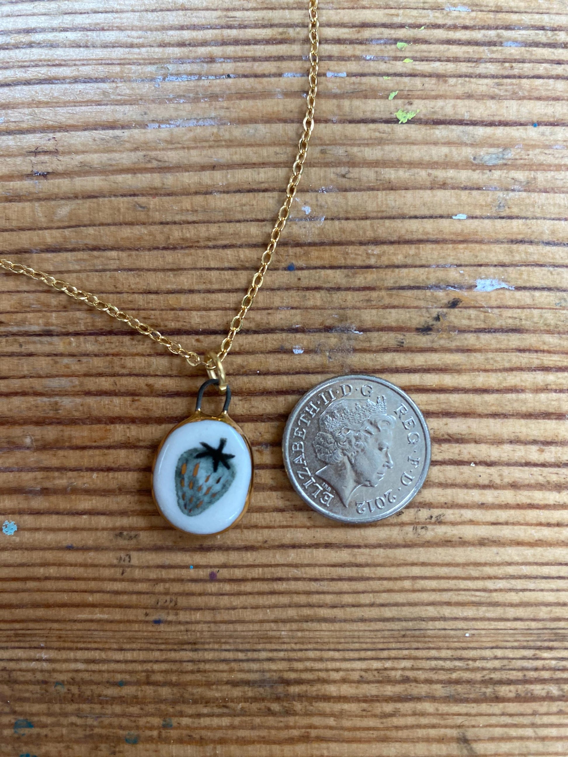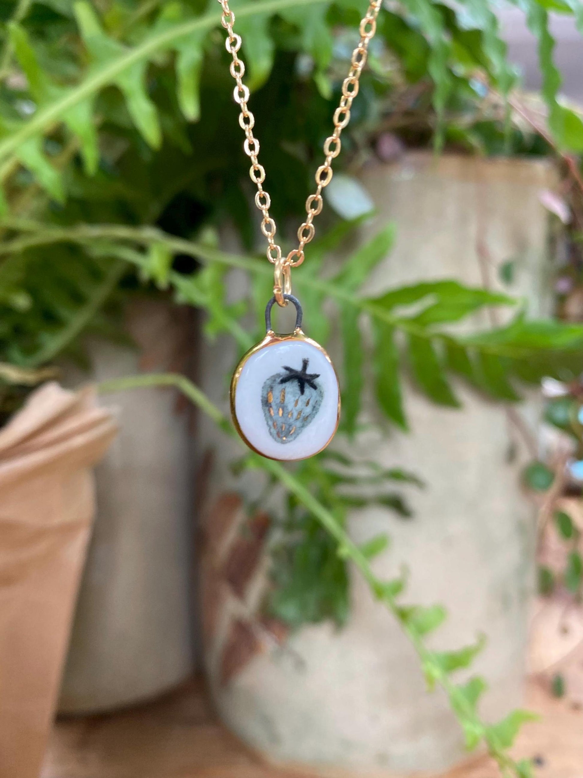 Hand-Sculpted Porcelain Strawberry Pendant: 24k Gold Lustre Ceramic Necklace Charm
